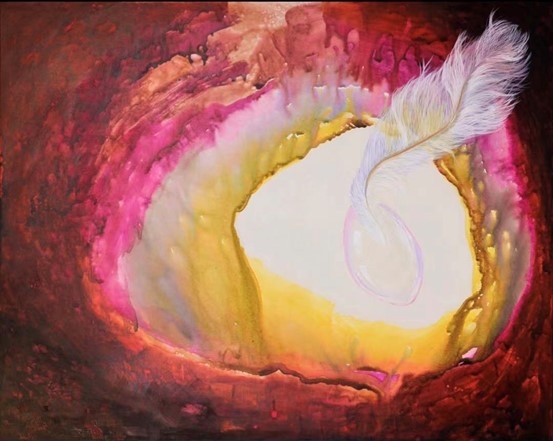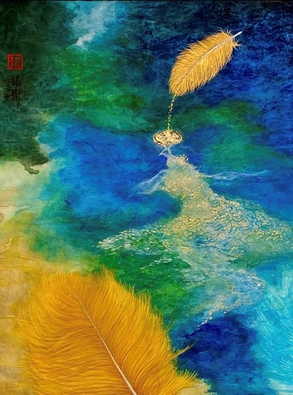 師從書法家張聖果研習書法,令董慧在羽毛的繪制上,剛柔並濟,既呈現出羽肢的骨感,柔韌的力度、又不乏羽毛柔軟飄逸的千種風情。男性的剛與女性的柔並濟,相護相生,相依相融,從而表達了她對生命的禮讚。